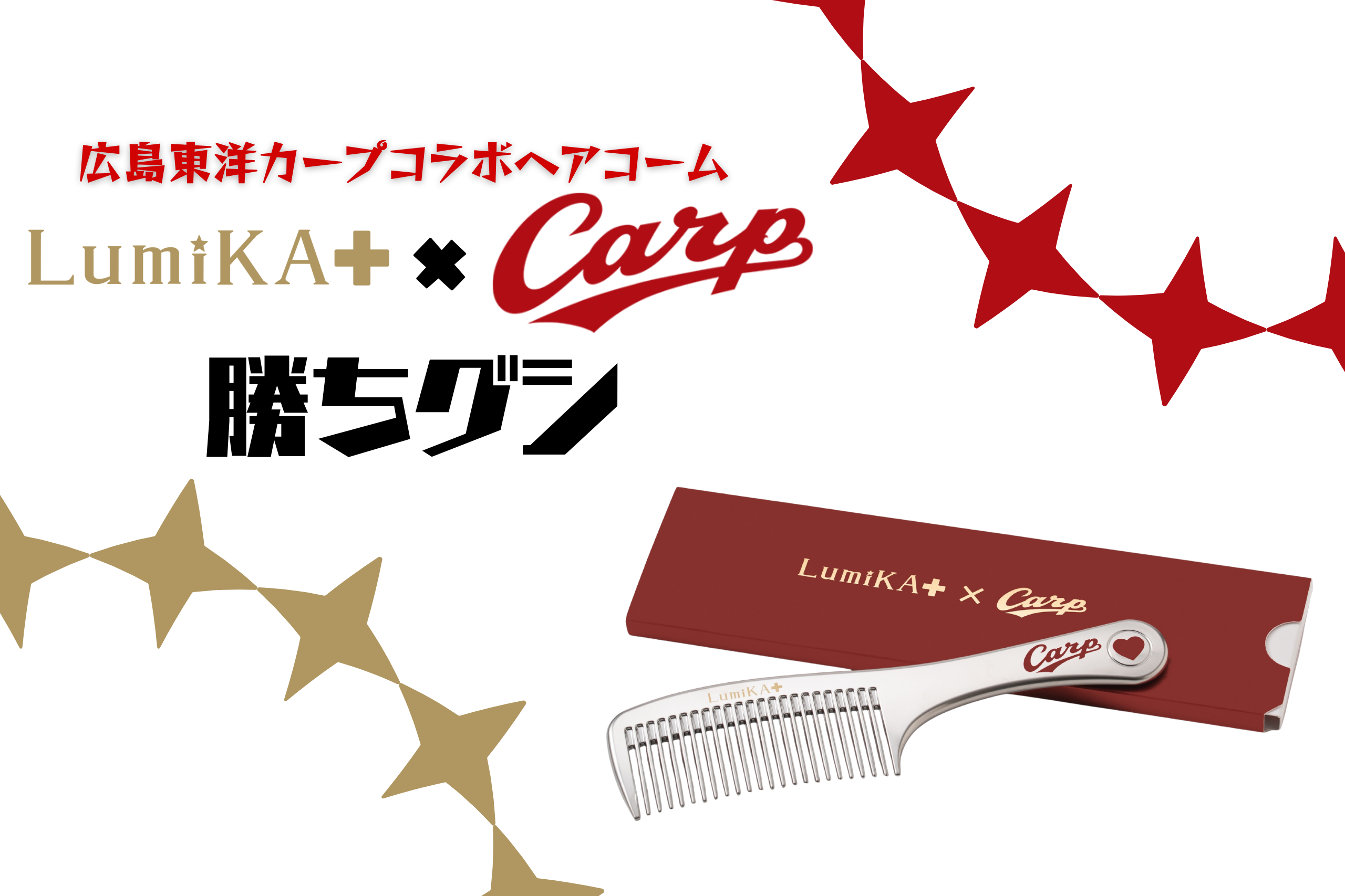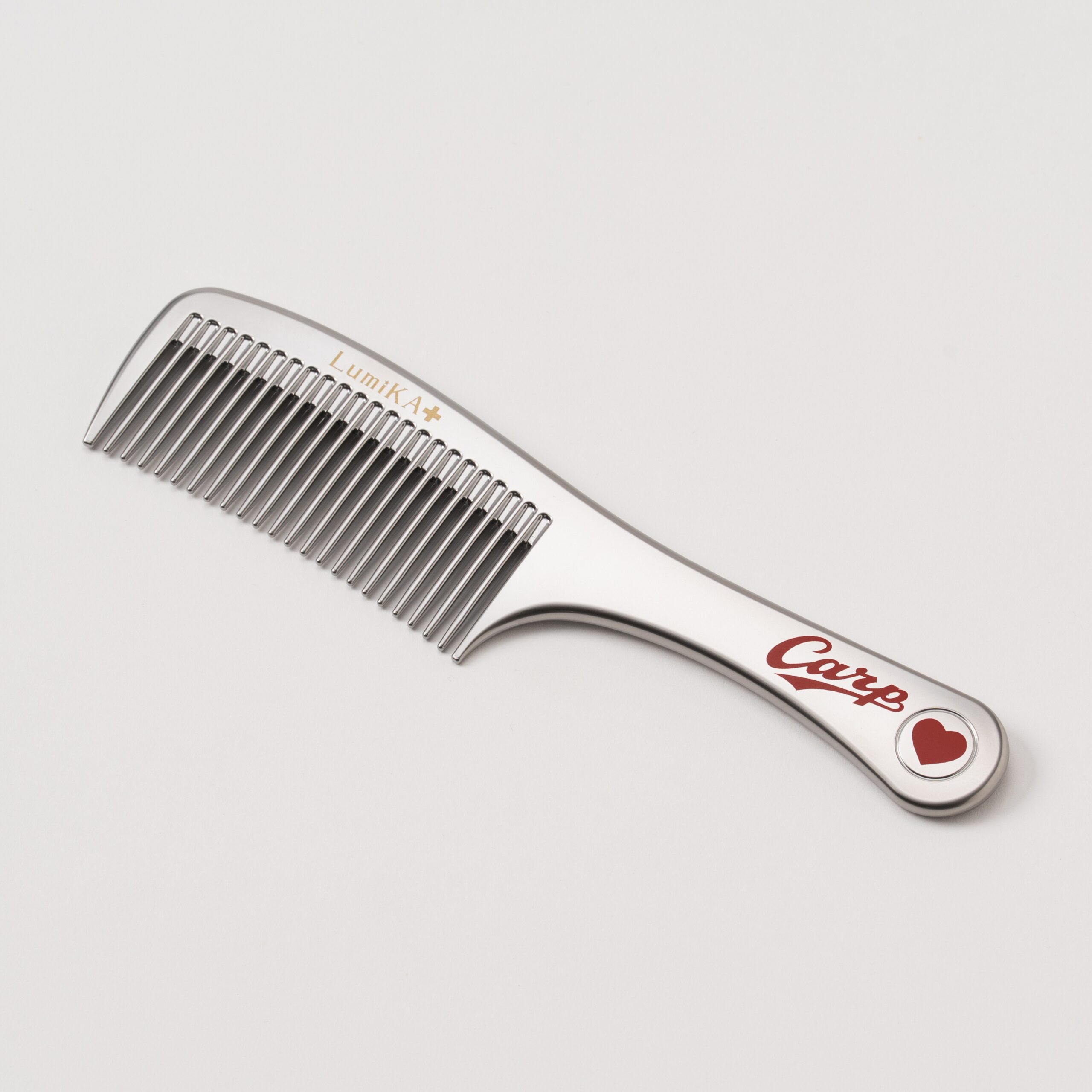 LumiKA+と広島東洋カープがコラボした2026年のカープグッズ。プラチナローズコームシルバーにカープのロゴとハートマークが印刷されて