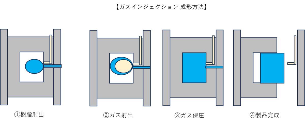 ガスインジェクション成形とは、プラスチック成形技術の一つであり、まず、ペレット状のプラスチック原料を加熱によって溶かし、柔らかく流動性のある状態にします。この溶けたプラスチックを射出成形機などの専用の機械を用いて金型の内部に正確に流し込み、製品の外側の形状や輪郭を形成します。ここまでの工程は、従来の射出成形とほぼ同じですが、ガスインジェクション成形の特徴はここから始まります。外周部がある程度形作られた後、まだ完全に固化していない樹脂の内部に高圧の窒素ガスを注入します。この窒素ガスは、注入された瞬間から樹脂の中心部を押し広げ、周囲の樹脂を外側に押し付ける力として働きます。その結果、樹脂の中心部分がガスによって置き換えられ、中空の空洞構造を意図的に作り出す技術です。