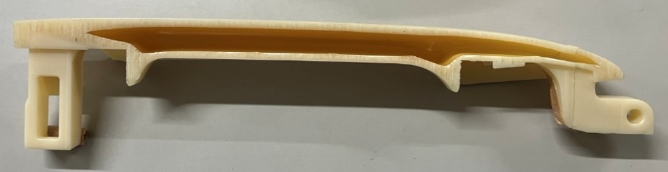 たとえば、自動車の部品ではステアリングハンドルやドアハンドルなどがあります。車の部品はしっかりした強さが必要ですが、同時に軽くしないと燃費が悪くなるので、中を空洞にできるガスインジェクションがとても役立っています。